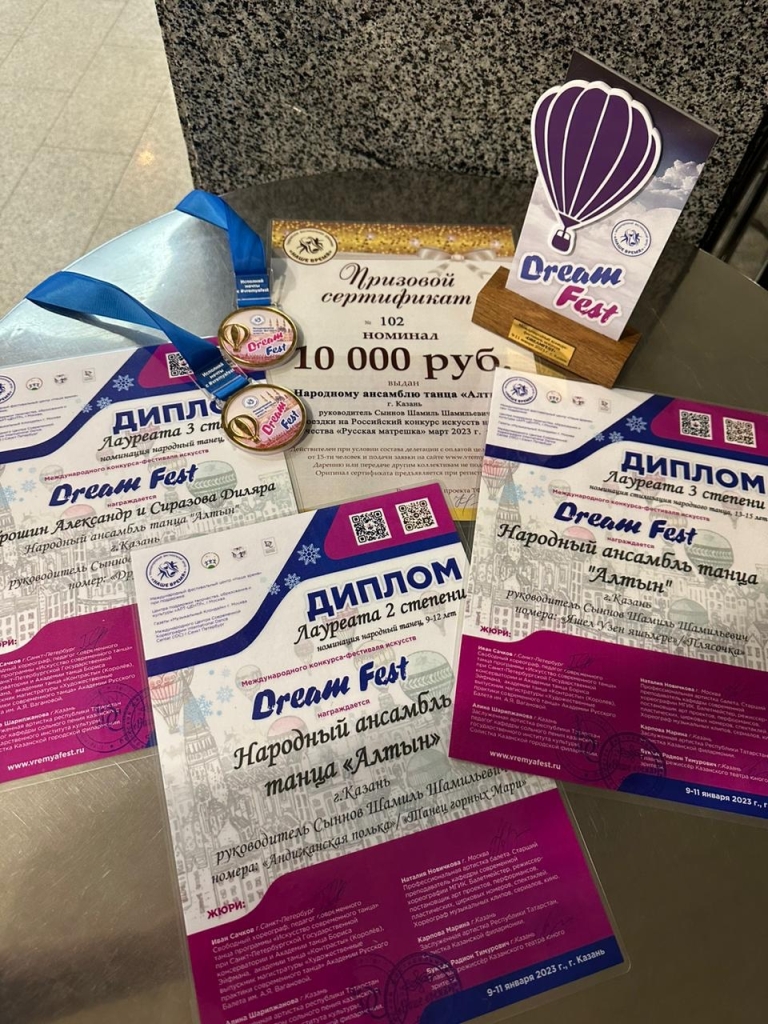 С 9-10 января 2023 года в КСК УНИКС проходил Международный конкурс-фестиваль искусств «DREAM FEST”, в котором приняли участие учащиеся объединения «Алтын». В конкурсе участвовали коллективы практически со всей России и не только. В сложившейся упорной борьбе за призовые места объединение «Алтын» заслуженно выиграли 3 из них! Стали Лауреатами 2 степени в номинации «Народный танец» (возрастная категория 9-12 лет), Лауреатами 3 степени в номинации «Народный танец» (возрастная категория 13-15 лет), Лауреатами 3 степени в номинации «Дуэт»! Искренне радуемся и поздравляем с успехами на международном уровне! /upload/storage/org986/files/2023 DREAM FEST 1.jpg /upload/storage/org986/files/2023 DREAM FEST 2.jpg /upload/storage/org986/files/2023 DREAM FEST 3.jpg /upload/storage/org986/files/2023 DREAM FEST 4.jpg /upload/storage/org986/files/2023 DREAM FEST 5.jpg