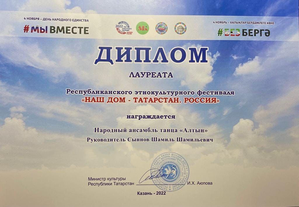 4 ноября 2022 года, в День народного единства, в концертном зале МВЦ «Казань Экспо» состоится Гала-концерт республиканского этнокультурного фестиваля «Наш дом – Татарстан». Учащиеся объединения "Алтын" стали лауреатами такого масштабного фестиваля!