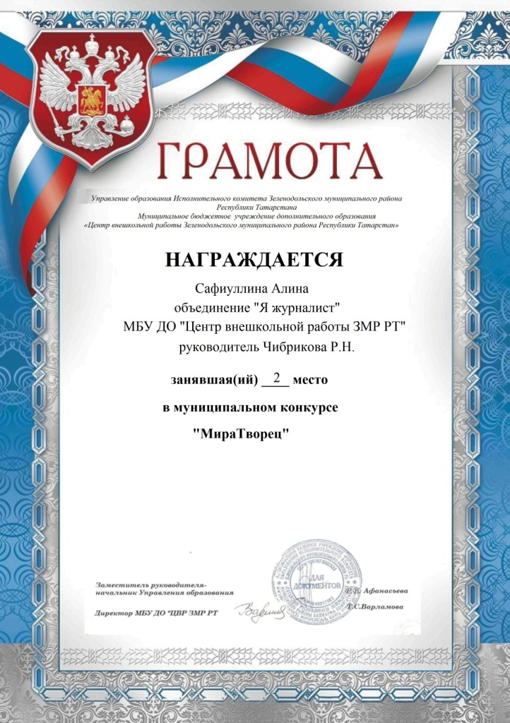 | Короткое название: | МБУ ДО "ЦВР ЗМР РТ" |
