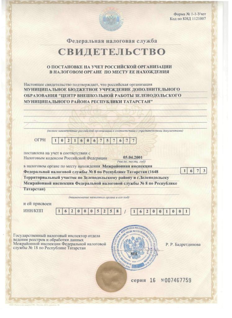 Свидетельство о постановке на учет в налоговом органе