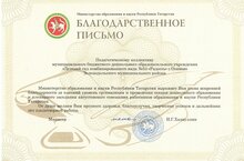 Благодарственное письмо Министерства образования и науки Республики Татарстан педагогическому коллективу Детского сада №53 "Радость" за высокий уровень организации и проведения секции дошкольного образования и пленарного заседания августовского совещания работников образования и науки РТ.