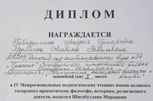 Гибадуллину Альфию Гумаровну и Яруллину Альбину Равильевну, занявших II место в IV Межрегиональных педагогических чтениях имени великого татарского просветителя, философа, историка, религиозного деятеля, педагога Шигабутдина Марджани.