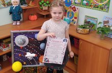Нашу воспитанницу Грачеву Александру (группа № 12), которая завоевала ГРАН-ПРИ в муниципальном творческом конкурсе, посвященного Всемирному дню авиации и космонавтики "Таинственный космос" в номинации "Декоративно-прикладное творчество"