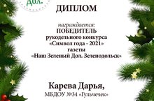 Кареву Дарью, воспитанницу группы № 10, воспитатель Гильметдинова Луиза Диларитовна, с победой в рукодельном конкурсе "Символ года - 2021" газеты "Наш Зеленый Дол. Зеленодольск"