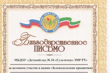 34-нче балалар бакчасының, әти-әниләре һәм балалары тәрбиячәләре "Яшел Үзән крышечки" акциясендә катнашкан өчен рәхмәт хатлары белән бүләкләнде