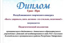 Коллектив детского сада принимает поздравления с заслуженной оценкой Гран - При в Республиканском творческом конкурсе "Быть активным, жить активно, это стильно, позитивно"!