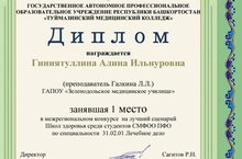 Поздравляем с Победой!!! 12.03.2021 Поздравляем студентку 411 группы Гиниятуллину Алину Ильнуровну и преподавателя Галкину Л.Л. с победой в межрегиональном конкурсе на лучший сценарий Школ здоровья среди студентов СМФОО Приволжского федерального округа по специальности 31.02.01 Лечебное дело.