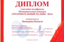 Воспитанница подготовительной группы Зиннурова Камиля участвовала в муниципальном конкурсе «Очаровательный малыш-2014» и была награждена дипломом за прекрасное исполнение новогоднего стихотворения. Поздравляем!