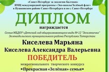 Семья Киселевых ( мама Александра Валерьевна и дочка Марьяна) принимают участие в межрегиональном творческом конкурсе «Прекрасная «Зелёная» семья». «Зелёная» семья живёт в гармонии с природой, радуется каждому дню и знает, что вместе они могут сделать мир лучше. Мать и дитя – что может быть красивей! "Прекрасная "Зеленая семья"- экологический конкурс, который будет проходить в Санкт-Петербурге. Семья Киселевых представляет свою работу "Материнство" в номинации «Экофейный вернисаж».