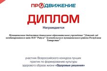 Балалар бакчасы коллективы "Сәламәт карар" Бөтенроссия конкурсында катнашты. Конкурс профсоюз оешмаларының сәламәтлекне саклау, физкультура-сәламәтләндерү һәм спорт инициативаларын һәм мәгариф системасы хезмәткәрләре өчен программаларны гамәлгә ашыру, мәгариф мохитендә сәламәт яшәү рәвешен һәм массакүләм спортны пропагандалау буенча гамәлдәге эш практикаларын ачыклауга юнәлдерелгән.