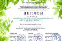 Тәрбияче Р.А. Закирова җитәкчелегендәге өлкән төркем тәрбияләнүчеләре "Урман-безнең яшел дустыбыз"интерактив плакат республика конкурсында катнаштылар.