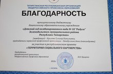 21 октябрьдә Пушкин исемендәге Казан мәдәният үзәгендә "Социаль партнерлык территориясе"Бөтенроссия мәгариф берлегенең Татарстан республика оешмасының республика проектын тәмамлау тантанасы булды. Әлеге проект Татарстан Республикасында социаль партнерлыкның 30 еллыгына һәм тармакта корпоратив мәдәният елына багышланган. Конкурста республиканың 90 тан артык мәгариф учреждениесе катнашты.Безнең балалар бакчасы да читтә калмады. Видео интервью, эссе һәм фотосурәтләр ярдәмендә "Салават күпере"балалар бакчасында социаль партнерлык практикасы турында сөйләдек.
