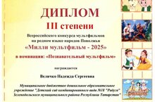 Поздравляем воспитателя Величко Н.С. с победой (Диплом IIIстепени) во Всероссийском конкурсе мультфильмов на родном языке народов Поволжья "Милли мультфильм-2025".