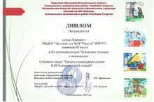Поздравляем! З место в номинации семейное видео "Читаем и показываем сказки К.И. Чуковского всей семьёй". Молодцы!III муниципаль Чуков укуларында Л.Лев гаиләсе белән катнашты. Котлыйбыз! "Бөтен гаилә белән К.И. Чуковский әкиятләрен укыйбыз һәм күрсәтәбез"гаилә видеосы номинациясендә 3 урынга лаек булдылар. ӘФӘРИН!