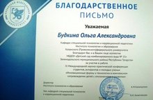 Кафедра специальной психологии и коррекционной педагогики Института психологии и образования «Казанского(Приволжского) федерального университета благодарит Будкину Ольгу Александровну и в ее лице коллектив МБДОУ«Детский сад комбинированного вида № 15 «Ромашка» Зеленодольского муниципального района Республики Татарстан» за участие в работе III Международной научно-практической конференции студентов, аспирантов и молодых ученых «Инновационные формы и технологии в комплексном сопровождении детей с отклонениями в развитии». -