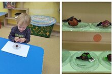 Тихий час у паучка".Табигый материал белән эшләгәндә, "Кояшлы куяннар" төркеме егетләре матур гына эш алып бармыйлар, кечкенә моториканы да үстерәләр, бу исә сөйләм үсешенә ярдәм итә. "Кояшлы куяннар" төркеменең кәстәнә үрентеләре искиткеч матур килеп чыкты."Үрмәкүчне пәрәвезгәАякларын да яшерде.Хәзергә уятма аны,Тыныч сәгать паучка янында». -