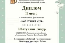 Воспитанник группы "Звездочки" Ибатуллин Тимур принял участие в региональном конкурсе "Мой лучший Мурр" с рисунком по сказке А.Алиша "Котёнок" и занял призовое место.Поздравляем!