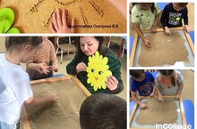 Менә безнең тәрбияләнүчеләр дә кум терапиясе сеансында булдылар. Биредә, кум кулланып, алар үзләренә таныш образлар - солнышко, йорт һ.б. барлыкка китерәләр. Шулай ук яртысын да кисәткәннәр. Балаларга күп тәэсир бирелде. -