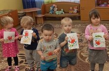Сегодня малыши 10 группы рисовали ладонями петушка, а точками рисовали горох для петушка.
