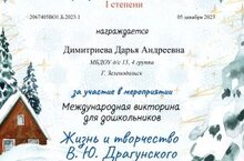 С 1 по 5 декабря воспитанники подготовительной группы "Пчёлки" на сайте "Совушка" принимали участие в онлайн - викторине "Жизнь и творчество В.Ю.Драгунского" и показали отличные результаты.