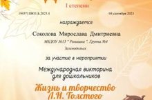 1 сентябрьдән 5 сентябрьгә кадәр "Пчёлки" әзерлек төркеме тәрбияләнүчеләре "Совушка" порталында "Л.Н.Толстой тормышы һәм иҗаты" мәктәпкәчә яшьтәге балалар өчен халыкара викторинада катнаштылар һәм бик яхшы нәтиҗәләр күрсәттеләр.