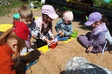 Ел буе әзерлек балаларны караган: алар белән уйнаганнар, йөрү өчен киенергә һәм чишенергә ярдәм иткәннәр. Бүген әзерлек төркеменнән балалар кечкенәләрне комнан куличкалар ясарга өйрәттеләр.Җәй көне алар белән тагын бер тапкыр да уйнарга килмәячәкләр. -