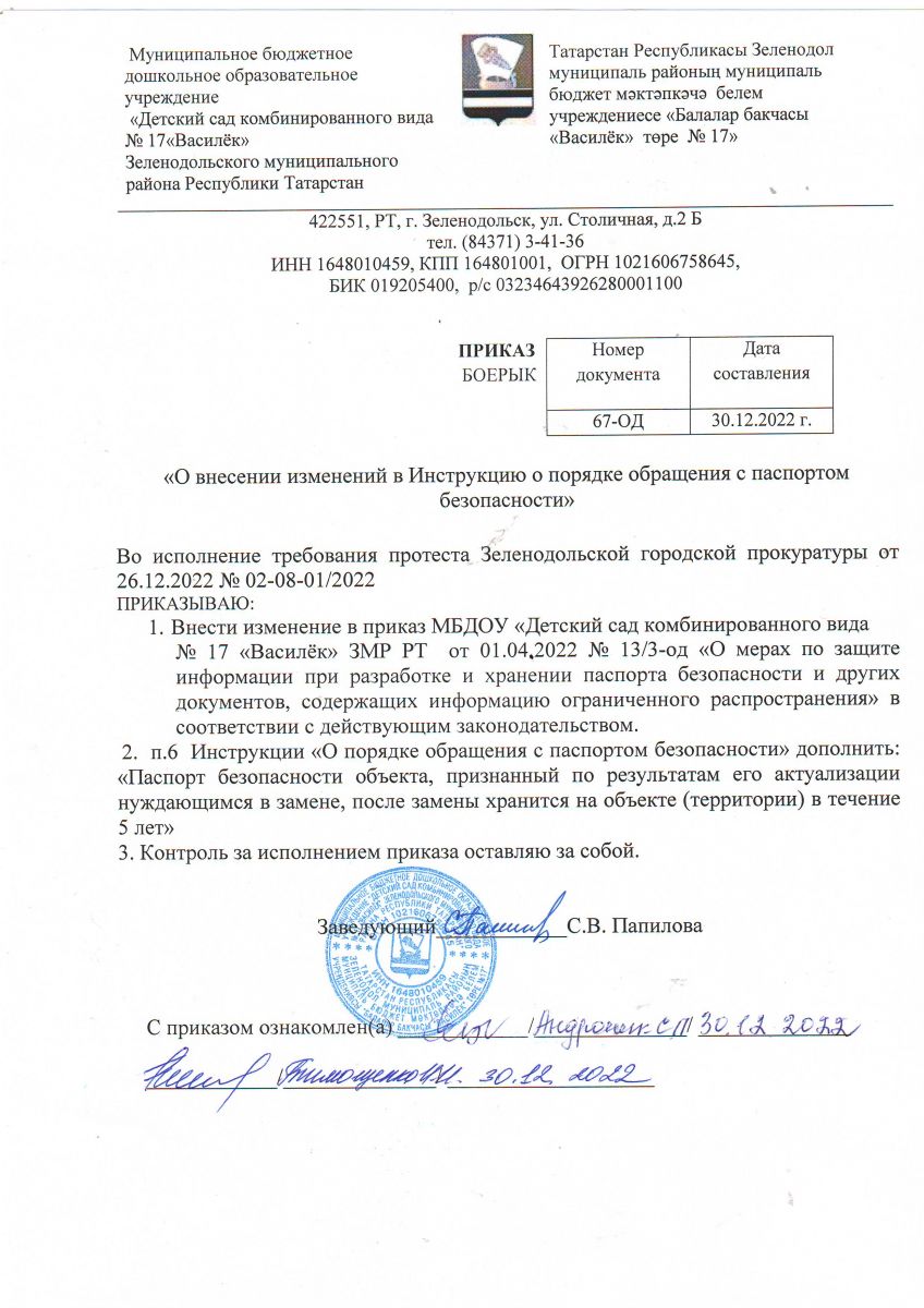 Приказ "О мерах по защите информации при хранении паспорта безопасности и других документов, содержащих информацию ограниченного распространения"
