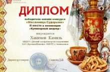 Безнең тәрбияләнүче Хәкимов Камил "Масленица Сударыня" онлайн-конкурсында "кулинария шедевры"номинациясендә 2 урын яулады. Котлыйбыз сезне!!!