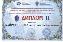 Поздравляем нашу коллегу, Хайрутдинову Алевтину Валентиновну, получившую диплом второй степени за участие в VII Международной научно практической конференции "Казанские научные чтения студентов и аспирантов имени В.Г. Тимирясова - 2017". Желаем творческих успехов!