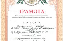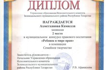 Поздравляем Ахметханову Камиллу, занявшую 2 место в муниципальном конкурсе правового воспитания "Ребенок в мире прав" в номинации Семейное творчество! /Гаилә иҗаты номинациясендә "Бала хокук дөньясында" муниципаль хокукый тәрбия конкурсында 2 урын алган Әхмәтханова Камилланы котлыйбыз!