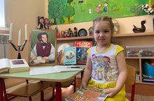 В старших группах детского сада ко Дню русского языка в день рождения выдающегося русского поэта А.С.Пушкина были организованы книжные выставки. Дети знакомились с творчеством поэта, читали сказки и стихи, рассматривали иллюстрации к произведениям А.С.Пушкина. /Балалар бакчасының өлкән төркемнәрендә рус теле көне уңаеннан күренекле рус шагыйре А.С. Пушкинның туган көнендә китап күргәзмәләре оештырылды. Балалар шагыйрьнең иҗаты белән таныштылар, әкиятләр һәм шигырьләр укыдылар, А.С. Пушкин әсәрләренә иллюстрацияләр карадылар.