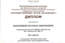 Старший воспитатель Наталья Николаевна Бабунова участвовала в Республиканском конкурсе по созданию авторских настольных и подвижных игр по экологии, организованном Волжско-Камским государственным заповедником "Изучаем природу: играя, но всерьез" и заняла 1 место в номинации интерактивная игра./ Өлкән тәрбияче Наталья Николаевна Бабунова Идел-Кама дәүләт тыюлыгы оештырган "табигатьне өйрәнәбез: җитди уйнаганда" дип аталган экология буенча авторлык өстәл һәм хәрәкәтчән уеннарын булдыру буенча республика конкурсында катнашып, интерактив уен номинациясендә 1 урынны яулады.