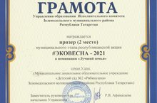 Детский сад участвовал в муниципальном этапе республиканской акции "Эковесна-2021" в двух номинациях: "Экосадик" и "Лучшая семья" и занял призовые места. Поздравляем! /Балалар бакчасы "ЭКОяз-2021" республика акциясенең муниципаль этабында ике номинациядә катнашты: "Экосадик" һәм "иң яхшы гаилә". Котлыйбыз!