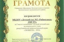 Детский сад награжден грамотой за 2 место в номинации "Лучший детский сад" муниципального этапа республиканской природоохранной акции "ЭКОВЕСНА - 2019". Поздравляем!