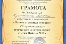Воспитанницы подготовительной к школе группы Мустафина Амина и Саитгараева Милана приняли участие в VII муниципальном творческом конкурсе чтецов "Весна Победы 2019". Обе девочки награждены грамотами победителей в различных номинациях. Милана- победитель в номинации "Салют Победе", Амина - победитель в номинации "Листая страницы истории". Гордимся нашими воспитанницами и поздравляем с победой!!!