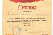 Старший воспитатель Бабунова Наталья Николаевна заняла 1 место в шахматном турнире в рамках курсов повышения квалификации "Методологические аспекты обучения детей игре в шахматы в рамках реализации ФГОС ДО" в НОУ ДПО "Центр социально-гуманитарного образования" г. Казань