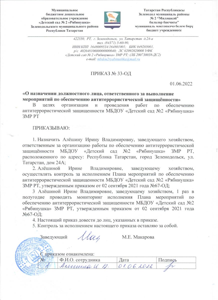 Приказ об ответственном по антитеррористической защищенности 2023 год