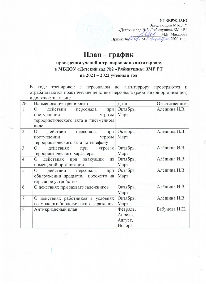 План проведения учений, тренировок по безопасной и своевременной эвакуации работников, воспитанников и иных лиц, находящихся на объекте (территории), при получении информации об угрозе совершения террористического акта либо о его совершении