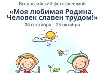 Уважаемые педагоги. Приглашаем Вас принять участие во Всероссийском фотофлешмобе "Моя любимая Родина. Человек славен трудом!" Издательского дома "Просвещение". Сроки проведения с 6 сентября по 6 октября. Подведение итогов 25 октября. Подробности в группе детского сада в контакте.