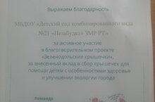 Команда "Экологично Зеленодольск" выражает благодарность детскому саду за активное участие в благотворительном проекте "Зеленодольские крышечки",за внесенный вклад в сбор крышечек для помощи детям с особенностями здоровья и улучшении экологии города.