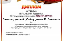 Музыкальный руководитель Окатов Дмитрий Игоревич и воспитанники подготовительной группы: Замалетдинов Азамат, Сайфутдинов Карим и Зиннатов Эмиль, заслуженно получили диплом I степени за участие в IX Международном конкурсе "Гордость страны" г. Москва в номинации "Песни войны". Желаем дальнейших успехов и побед этим талантливым ребятам.