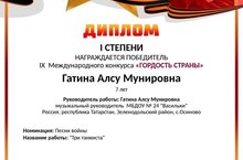 Поздравляем с дипломом I степени в IX Международном конкурсе "Гордость страны" г. Москва, музыкального руководителя Гатину Алсу Мунировну и ребят подготовительной группы в номинации: Песни войны "Три танкиста". Желаем дальнейших побед.