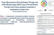 2021 год - Год родных языков и народного единства в Татарстане. В целях сохранения и развития родных языков, культуры и традиций представителей народов, проживающих в Республике Татарстан, укрепления единства многонационального народа республики 2021 год объявлен в Татарстане Годом родных языков и народного единства. Оргкомитет по проведению Года родных языков и народного единства и план основных будут утверждены Кабмином РТ в течение ближайших трех месяцев. Муниципальным образованиям, государственным органам, общественным объединениям и организациям предложено организовать работу по проведению данных мероприятий и принять в них активное участие.