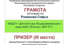 Безнең балалар бакчасында тәрбияләнүче Романова Софьяны Бөтенроссия экологик рәсемнәр конкурсының муниципаль этабында җиңү белән котлыйбыз Грамота 3 урын Молодец!!! Степановны котлыйбыз Назария грамота «Оригиналь якын килү» номинациясендә Молодец!!! Калашников Ролан һәм Хисамов Инсаф катнашучыларның сертификатларын алдылар. Барлык балаларга да алга таба да җиңүләр телибез!