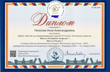Балалар бакчасы тәрбиячесе Пигасова Анна Александровнаны «Россиянең Ел тәрбиячесе-2024» Бөтенроссия дистанцион конкурсында җиңүе белән котлыйбыз Диплом Татарстан Республикасында урын: 1; Россиядә урын:3 Яхшы!!!Алга таба иҗади уңышлар телибез!