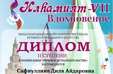 Безнең тәрбияләнүчебез Сафиуллина Диләне чираттагы җиңүе белән котлыйбыз! Дилә "Илһамият"- VII халыкара фестиваль-конкурсында катнашты һәм II дәрәҗә диплом белән бүләкләнде. Уңышлар сиңа, Дилә һәм яңа үрләр!