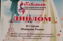 Мы рады сегодня поздравить нашу воспитанницу – Шакирову Рамину с очередной победой. Рамина приняла участие в Международном фестивале-конкурсе «Илһамият» - V и была награждена диплом II степени. Удачи тебе, Рамина и новых вершин!