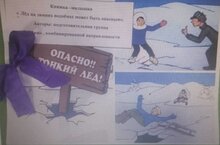 Безнең балалар бакчасында көз-кышкы чорда суда куркынычсызлык чаралары узды. Педагоглар балалар белән берлектә көзге-кышкы чорда балаларның һәм өлкәннәрнең су объектларында үз-үзләрен тотышының проблемалы ситуацияләрен актив хәл иттеләр. Балаларның белем бирү эшчәнлеге оештырылды: «Бәла булмасын өчен, су янында сак бул», «Сак булыгыз нечкә боз», «Су - дус, яки дошман», «Коткаручы һөнәре», темасына физкультура ялы: « Сак булыгыз! Нечкә боз! " Мультфильмнар һәм видеороликлар циклы каралды: «Нечкә бозда», «Ябалак түтәй киңәшләре», «Иминлек әлифбасы».