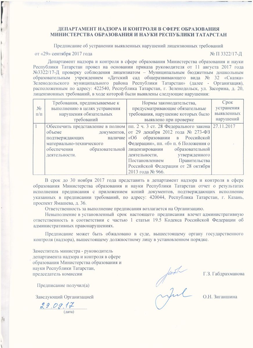 Предписание об устранении выявленных нарушений лицензионных требований от 29.09.2017 г.