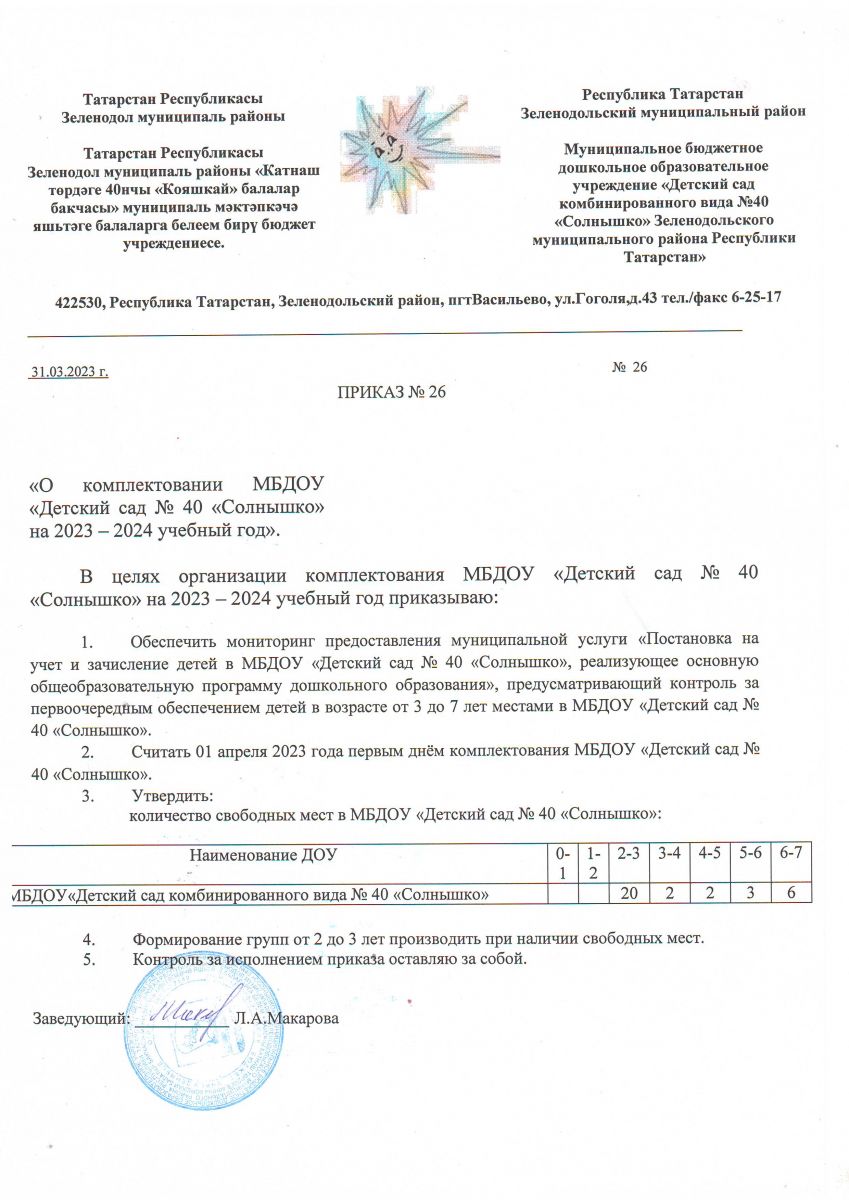 Хәерле көн! Хөрмәтле ата-аналар (законлы вәкилләр)! 1 апрельдән «Солнышко «40нчы балалар бакчасында балаларны комплектлау башлана. Сез Дәүләт хезмәтләре порталында үз статусыгызны күзәтә аласыз (gosuslugi.ru). Әгәр сезнең статусыгыз «ДОУга җибәрелгән» булса, 2023 елның 30 апреленә кадәр учреждение җитәкчесе белән элемтәгә керергә кирәк. Гаризаның "ДОУга җибәрелгән" статусы әлеге статус бирелгәннән соң 30 көн эчендә учреждение җитәкчесенә мөрәҗәгать итәргә кирәклеген аңлата.